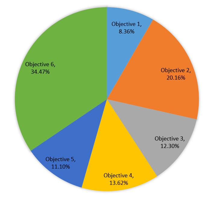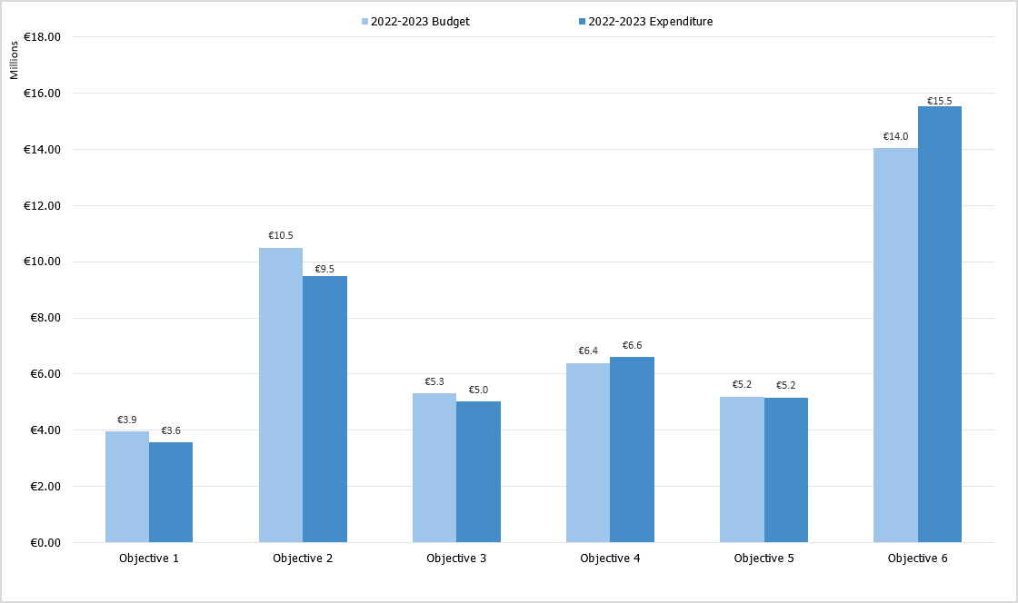 The activities during the previous biennium progressed well, and the figure below compares the budget and the expenditure in 2022-2023 for each strategic objective.
