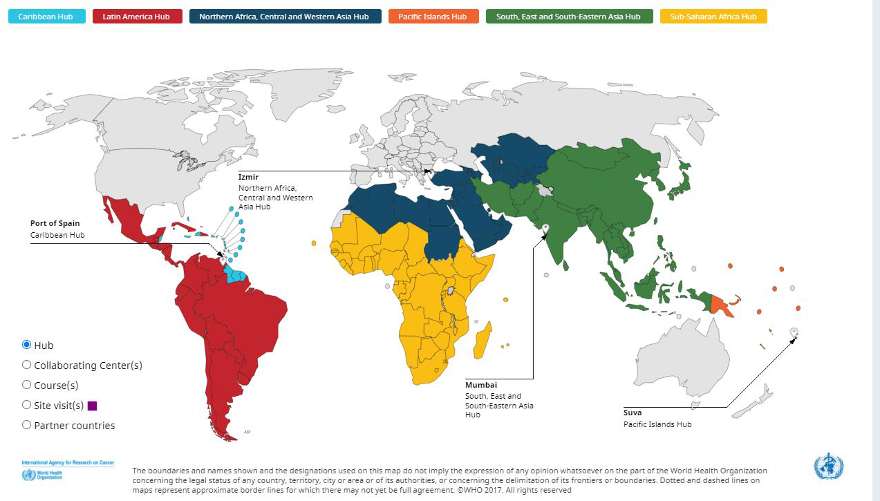 The Global Initiative for Cancer Registry Development (GICR) aims to markedly increase the coverage, quality, and use of data from population-based cancer registries in low- and middle-income countries (LMICs). Coordinated by IARC, the GICR brings together major international and national agencies committed to working collaboratively to improve cancer surveillance worldwide. Six IARC Regional Hubs serve as regional coordinating bodies for GICR activities and as the main point of contact for countries within Latin America and the Caribbean, Africa, Asia, and Oceania. GICR Collaborating Centres have been established to further strengthen capacity in cancer registration by delivering specific functions in identified geographical areas in one or more Hubs. The GICRNet uses a Train the Trainer model to form a network of experts, whereby standardized teaching materials for cancer registries are developed jointly between IARC and future trainers across the Hub regions.