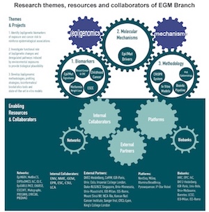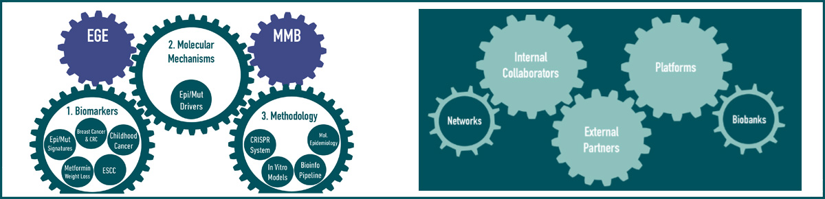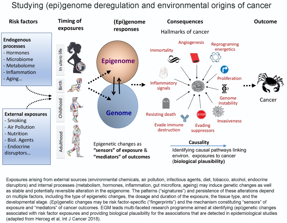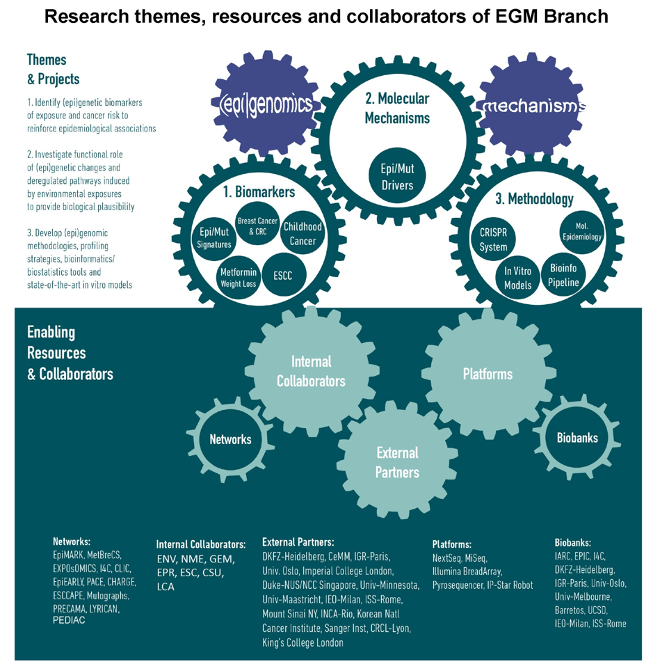 As outlined in Figure 1, EGM combines molecular epidemiology and experimental studies to investigate the roles of (epi)genomic and other molecular changes and deregulated pathways induced by environmental or lifestyle factors in cancer development, and to identify cancer biomarkers. EGM builds on existing and new collaborative work on human biospecimens using genomic platforms, molecular and cell biology, and biochemistry tools. EGM also develops relevant innovative methodologies, molecular profiling strategies, cancer modelling systems, and bioinformatics tools, applicable to population-based cohorts and molecular epidemiology studies coordinated by IARC researchers and external collaborators.