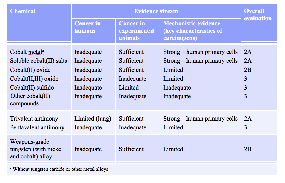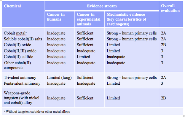 1 Karagas MR, Wang A, Dorman DC, Hall AL, Pi J, Sergi CM, et al. (2022). Carcinogenicity of cobalt, antimony compounds, and weapons-grade tungsten alloy. Lancet Oncol, Published online 7 April 2022; https://doi.org/10.1016/s1470-2045(22)00219-4