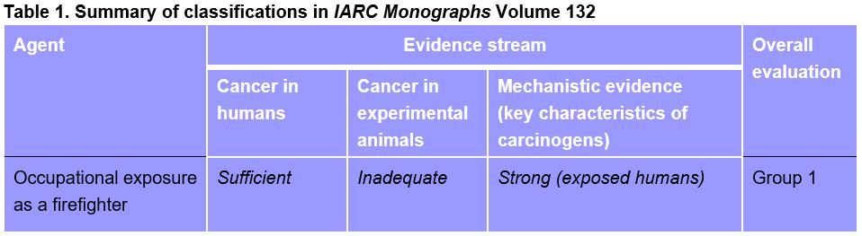 Occupational exposure as a firefighter was classified as carcinogenic to humans (Group 1) on the basis of sufficient evidence for cancer in humans.