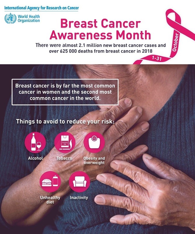 During October, the International Agency for Research on Cancer (IARC) will mark Breast Cancer Awareness Month with a series of videos, tweets, and infographics focusing on the global burden of breast cancer. In 2018, there were an estimated 2.1 million new cases of breast cancer and 627 000 deaths from breast cancer worldwide.