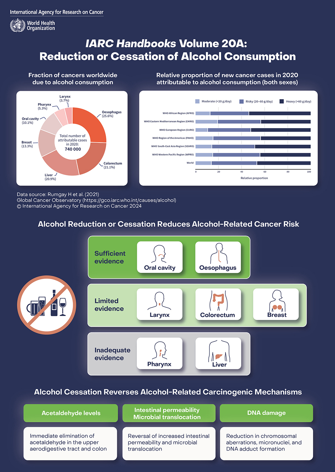 A Special Report from the International Agency for Research on Cancer (IARC), published in The New England Journal of Medicine, reviews and summarizes the available evidence on the effectiveness of reduction or cessation of alcohol consumption in reducing alcohol-related cancers. Read News item