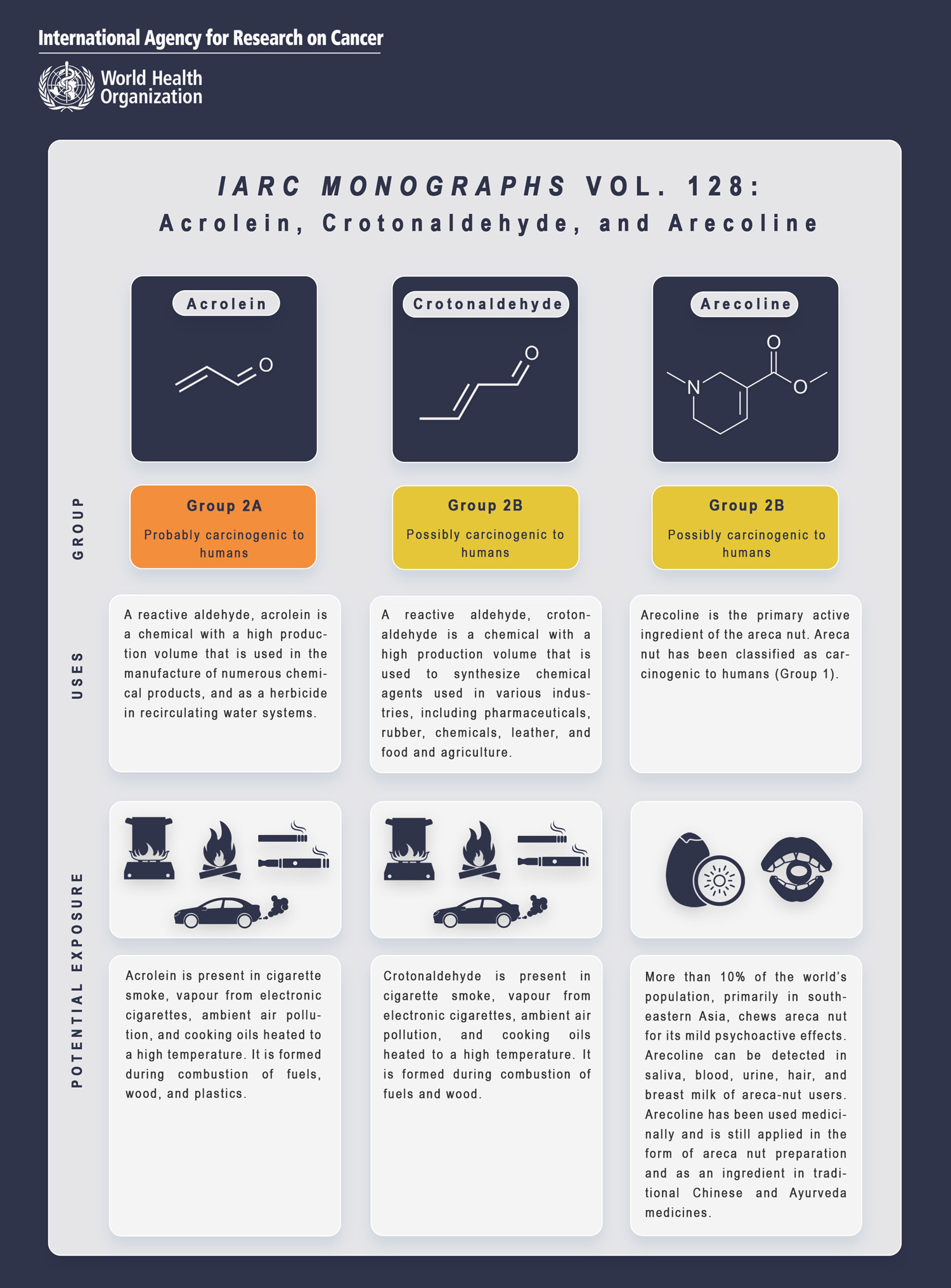 The results of the recent IARC Monographs evaluation of the carcinogenicity of acrolein, crotonaldehyde, and arecoline have now been published in The Lancet Oncology. This summary article presents the conclusions of IARC Monographs Meeting 128.