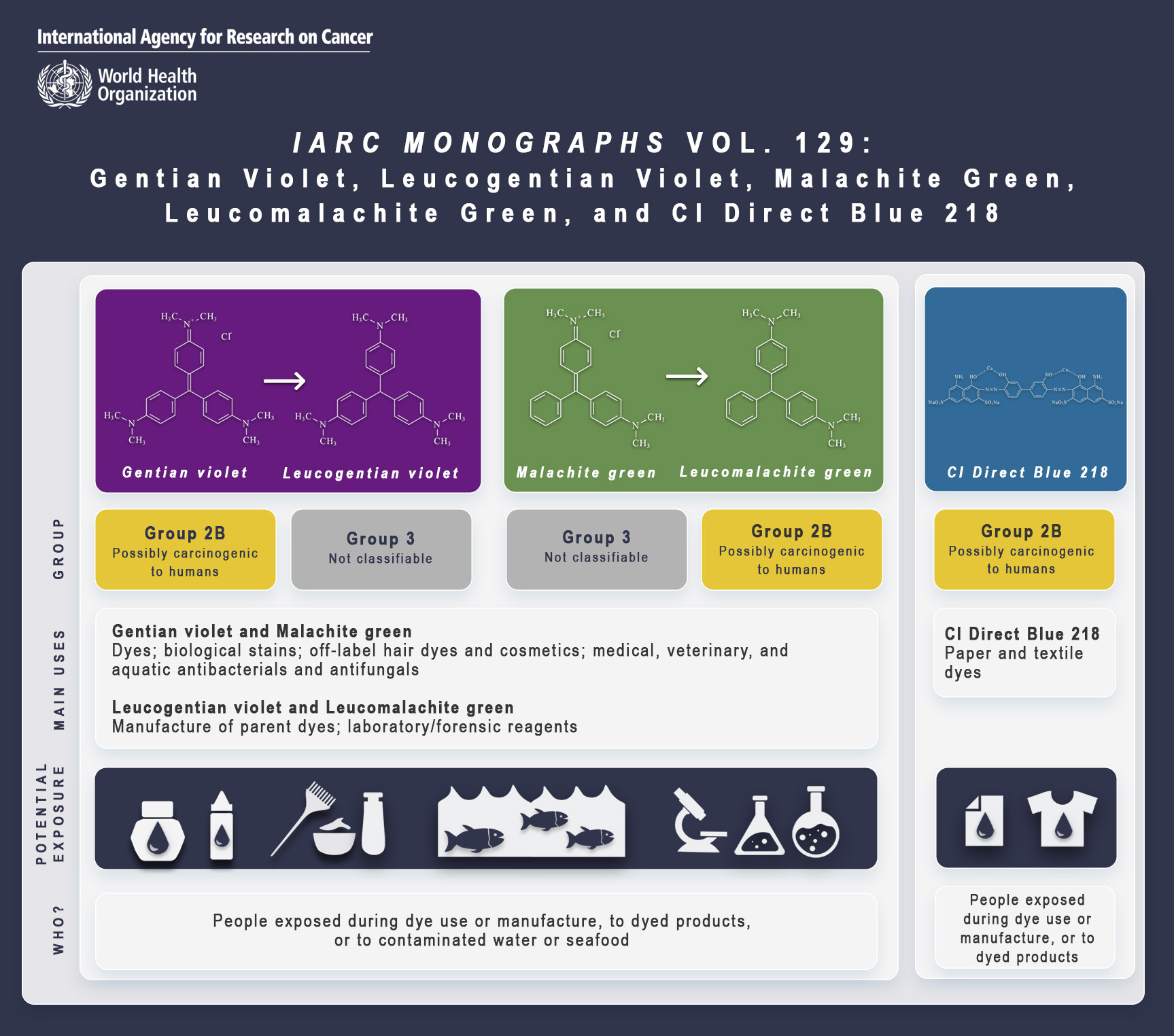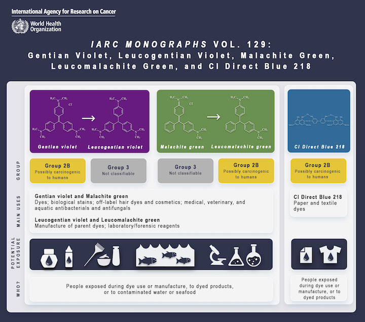 The results of the recent IARC Monographs evaluation of the carcinogenicity of gentian violet, leucogentian violet, malachite green, leucomalachite green, and CI Direct Blue 218 have now been published in The Lancet Oncology. This summary article presents the conclusions of IARC Monographs Meeting 129.