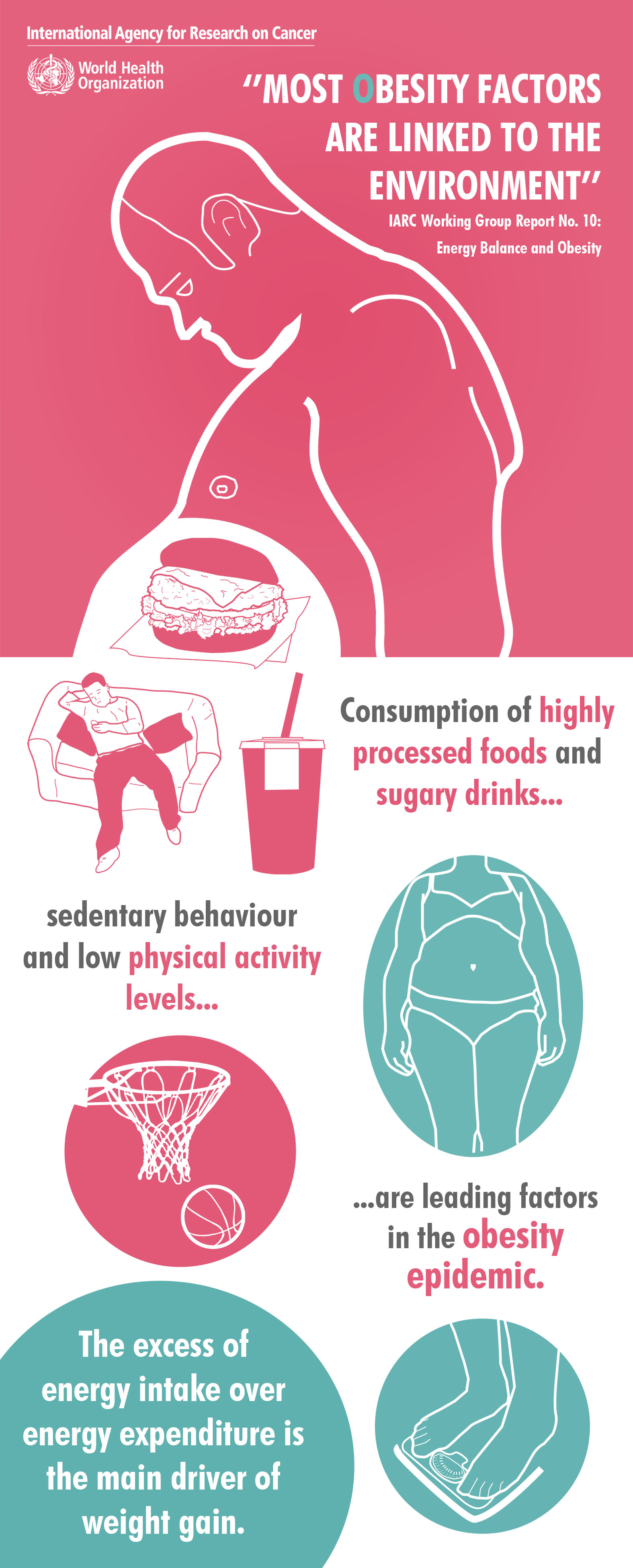 The International Agency for Research on Cancer (IARC) is pleased to announce the publication of a new IARC Working Group Report. The report, entitled Energy Balance and Obesity, reviews the drivers of obesity, including the roles of excess energy intake and specific foods and nutrients in the global obesity epidemic. The report is the result of the collaborative work of 17 international experts and is based on the latest scientific evidence.