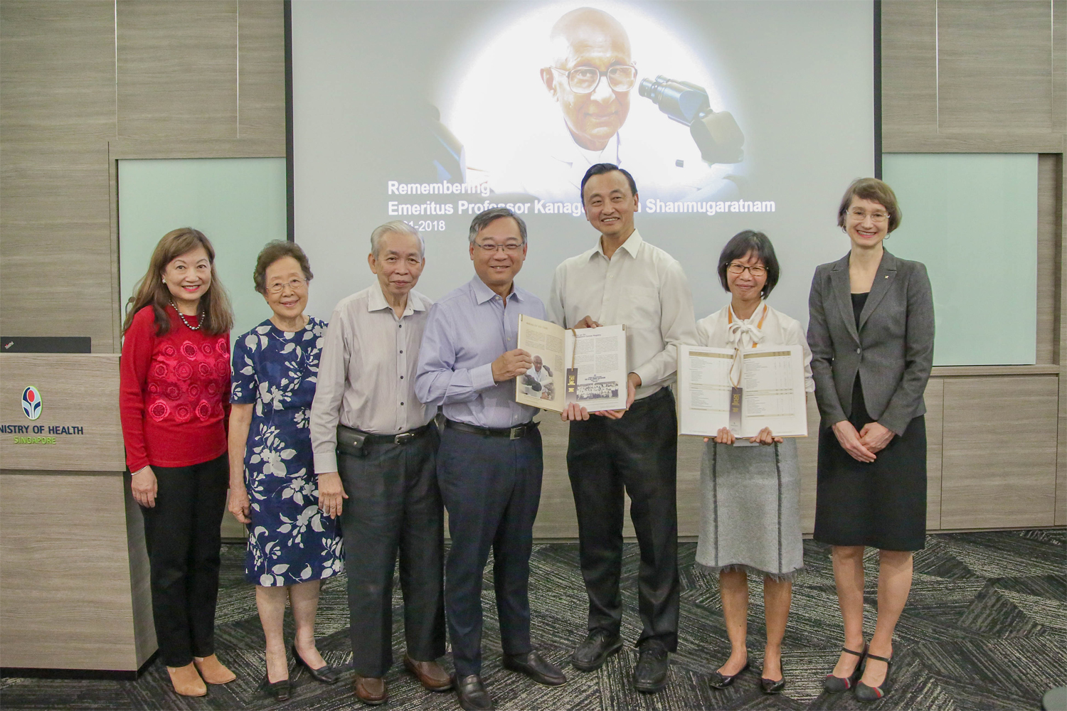 From left: Professor Tan Puay Hoon, Chairman, Division of Pathology, Singapore General Hospital; Associate Professor Ivy Sng, Visiting Consultant, Singapore General Hospital; Professor Lee Hin Peng, Emeritus Professor, Saw Swee Hock School of Public Health; Mr Gan Kim Yong, Minister for Health, Ministry of Health, Singapore; Professor Chia Kee Seng, Founding Dean, Saw Swee Hock School of Public Health; Dr Foo Ling Li, Deputy Director, National Registry of Diseases Office, Health Promotion Board; and Dr Elisabete Weiderpass, IARC Director.