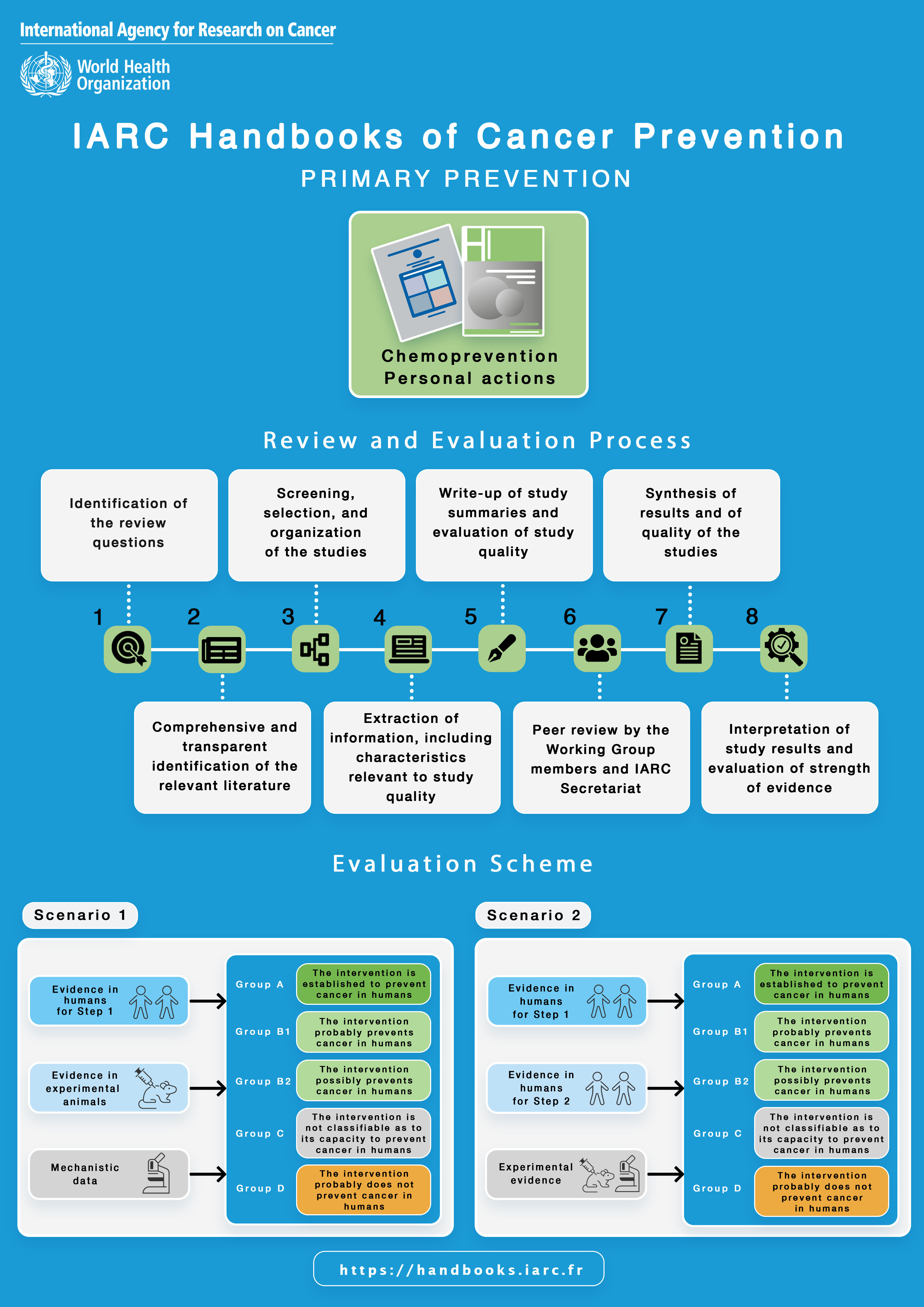 This new infographic presents the review and evaluation process of the IARC Handbooks and the scheme used for the evaluation of primary prevention methods (i.e. personal or societal actions that can be taken to lower the risk of developing cancer).