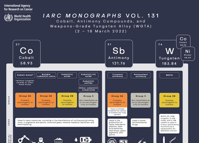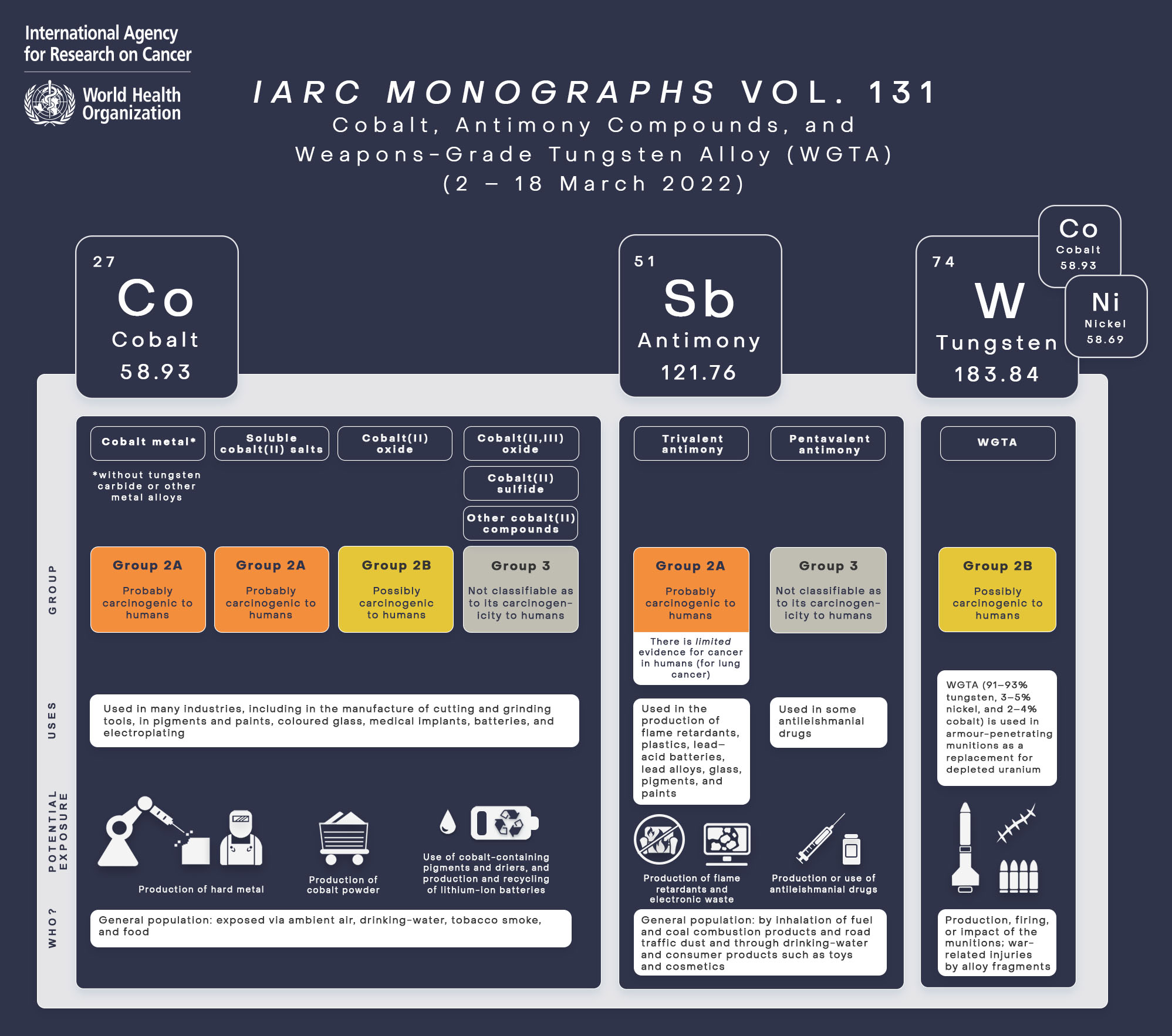 The results of the recent IARC Monographs evaluation of the carcinogenicity of nine agents, including cobalt metal (without tungsten carbide or other metal alloys), soluble cobalt(II) salts, cobalt(II) oxide, cobalt(II,III) oxide, cobalt(II) sulfide, other cobalt(II) compounds, trivalent antimony, pentavalent antimony, and weapons-grade tungsten (with nickel and cobalt) alloy, have now been published in The Lancet Oncology. This summary article presents the conclusions of IARC Monographs Meeting 131.