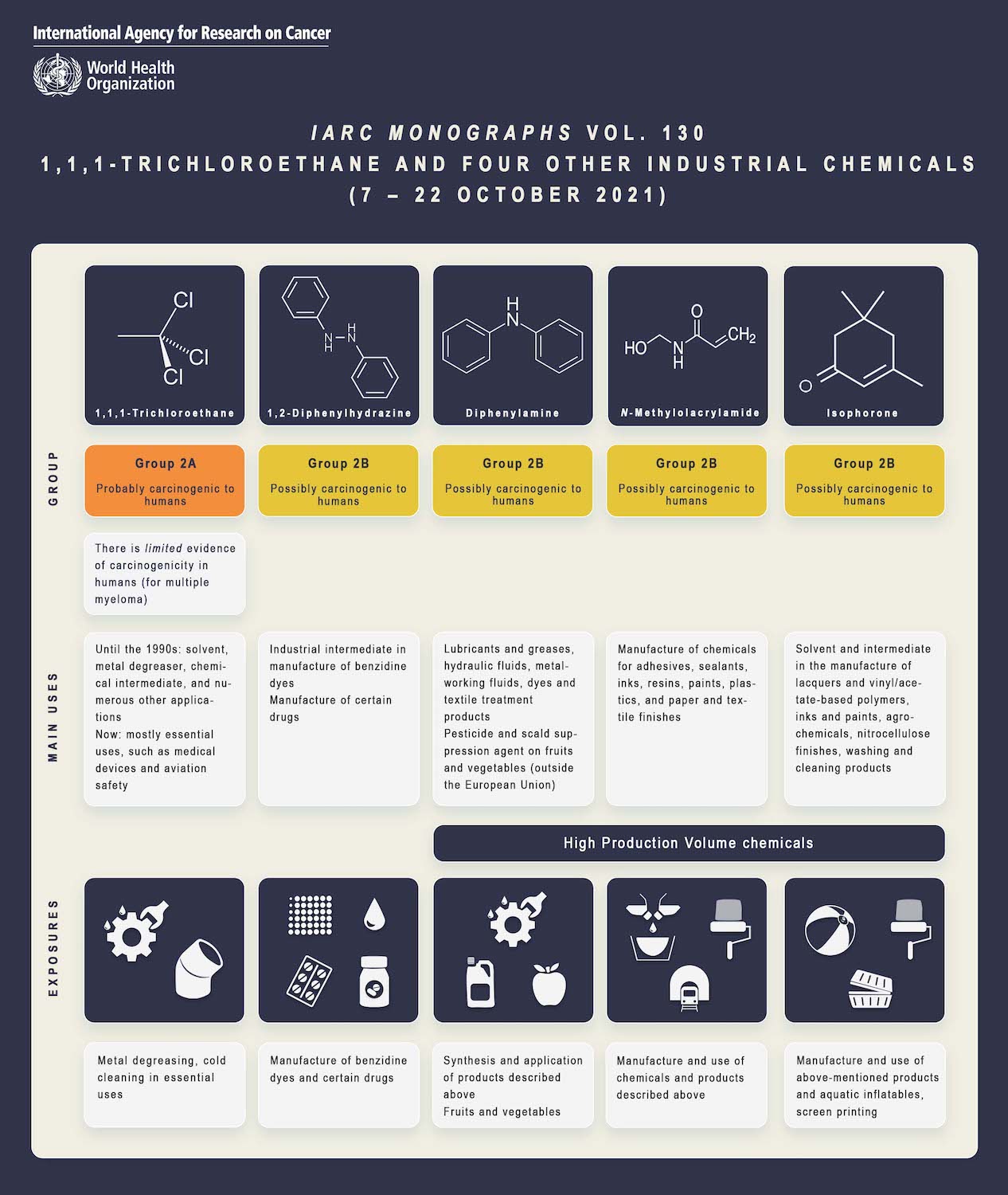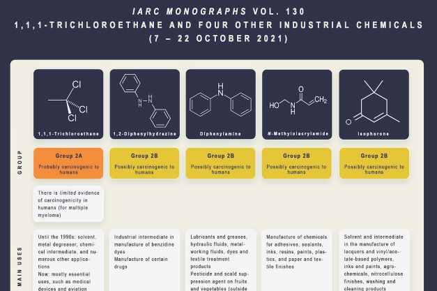 The results of the recent IARC Monographs evaluation of the carcinogenicity of 1,1,1-trichloroethane, 1,2-diphenylhydrazine, diphenylamine, N-methylolacrylamide, and isophorone have now been published in The Lancet Oncology. This summary article presents the conclusions of IARC Monographs Meeting 130.