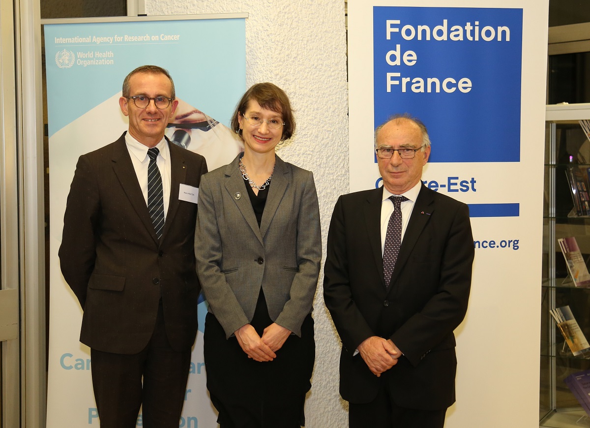 From left to right: Mr Pierre Mouton, President of the Rotary Club de Lyon, Dr Elisabete Weiderpass, IARC Director, and Mr Yves Minssieux, President of the Lyon committee of the Fondation de France Centre-Est.