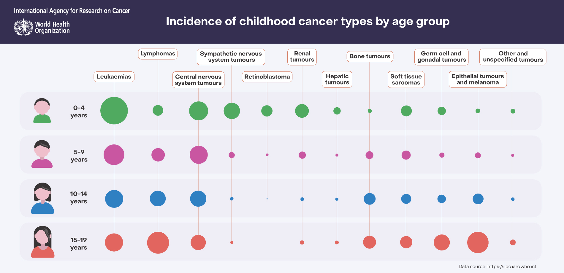 To mark International Childhood Cancer Day 2024, this new infographic from the International Agency for Research on Cancer (IARC) shows the incidence of childhood cancer types by age group.