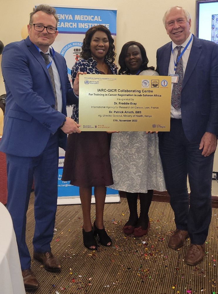 Dr Freddie Bray (Head of the Cancer Surveillance Branch at IARC) with Dr Anne Korir (Director of the Nairobi Cancer Registry) and Dr Gladys Chesumbai (Director of the Eldoret Cancer Registry), the co-Principal Investigators of the Collaborating Centre, and Dr Max Parkin (Coordinator of the AFCRN and IARC Senior Visiting Scientist)