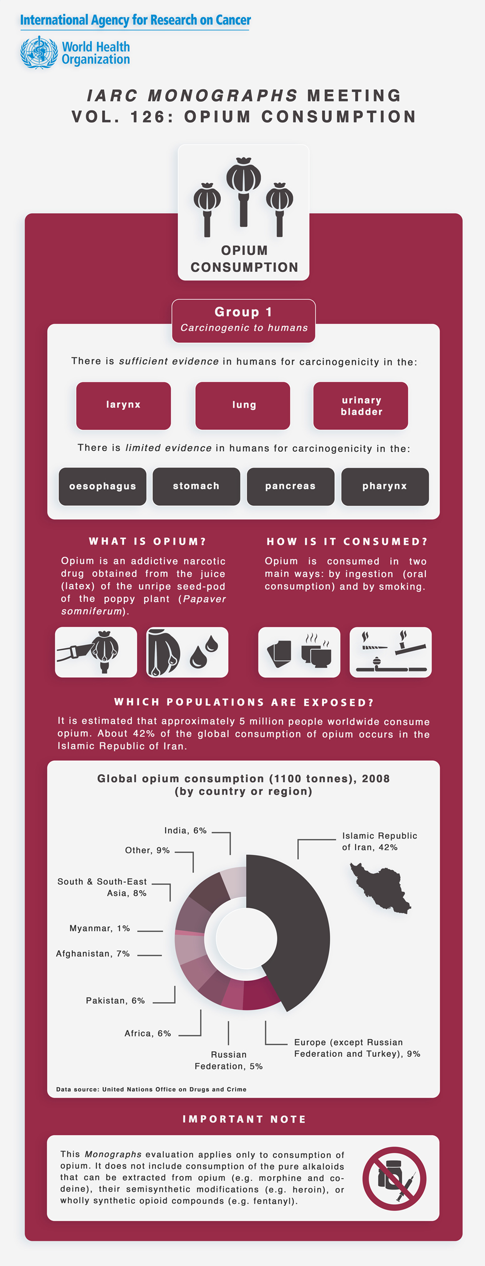 Opium, an addictive narcotic drug, is produced from the poppy plant, Papaver somniferum, and can be consumed as a variety of preparations, either by smoking or by ingestion. Opium derivatives (e.g. opiates such as morphine and heroin) and opioids (e.g. fentanyl) were not considered by the Working Group.